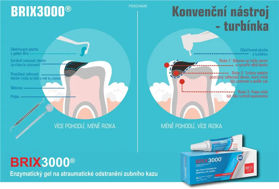 Bez nutnosti použít anestezii - 93% pacientů nepociťovalo při použití gelu BRIX®3000 žádnou bolest. Tato metoda slouží k tomu, aby byla odstraněna infikovaná tkáň a nezůstaly tam bakterie. Protože tak je zub samozřejmě odsouzen k zániku. Je důležité, aby nemuseli zubní lékaři zub extrahovat a udrželi ho ve funkci v zubním oblouku. Jedná se o metodu ATR (atraumatic restorative treatment) nebo-li atraumatická restaurační léčba.