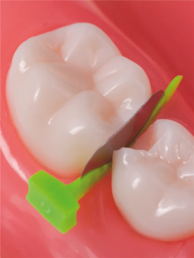 Unikátní kombinace preparačního štítu a sekční matrice pro výplně II. třídy dětských zubů.