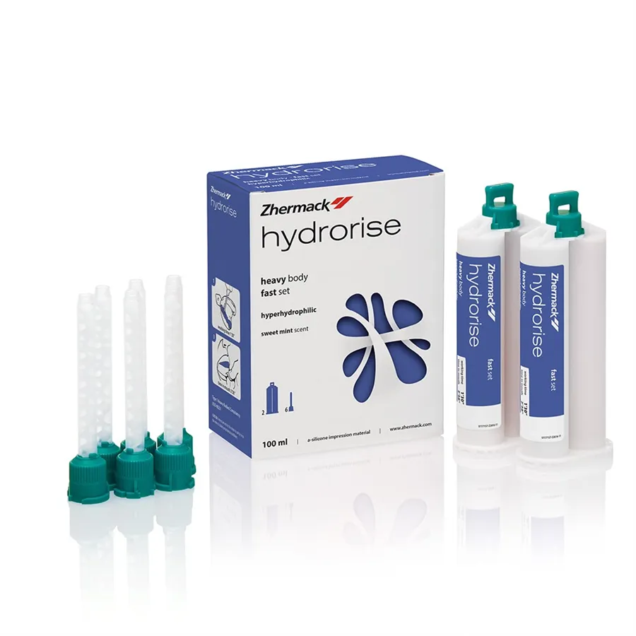 • A-silikonový otiskovací materiál vhodný pro jakoukoliv techniku otiskování použitelný v jakýchkoliv klinických podmínkách. • Snadná kombinace různých viskozit pro každou specifickou situaci se škálou časů tuhnutí pro jakoukoliv otiskovací metodu. • Extrémně flexibilní, zvláště v podsekřivinách, kdy při vyjmutí z úst nedochází k deformaci otisku. • Hyperhydrofílie - činí Hydrorise zatékavým tak, jako žádný jiný produkt na trhu • Vylepšený systém přesunu vlhkosti garantuje přesnou reprodukci detailů v orální kavitě, pro ideální úroveň zatékavosti v gingiválním sulku, dokonalejší reprodukci v hůře přístupných místech • Kontaktní úhel menší než 10° - nižší kontaktní úhel, vyšší smáčivost materiálu, díky tomu se může silikon perfektně adaptovat. • Putty: 2 x 300 ml, normal (2) nebo fast (1) tuhnutí. • Krémy: 2 x 50 ml a 12 míchacích kanyl, konzistence: regular, light, extra light, monophase a heavy body, normal (2) nebo fast (1) tuhnutí.