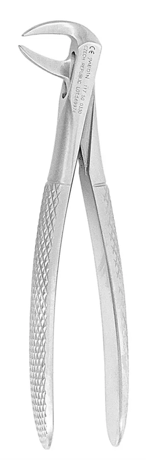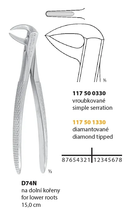 Extrakční kleště pevné konstrukce s ergonomicky tvarovanými branžemi se speciálním drážkováním na če...