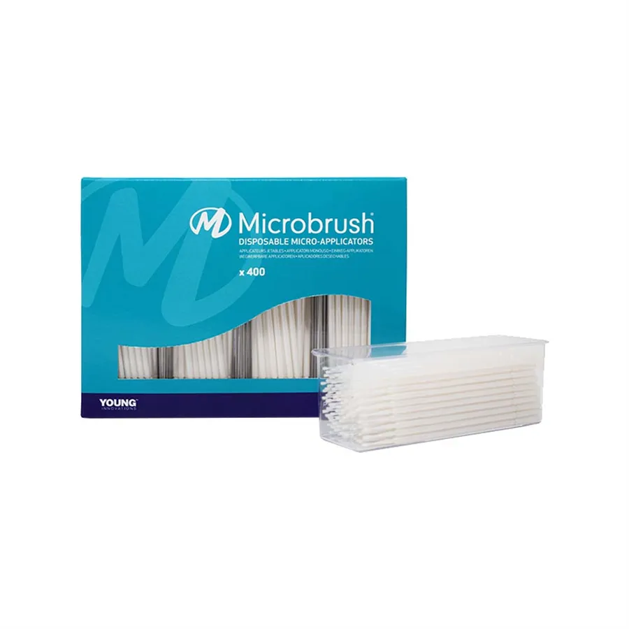 Miniaturní aplikátory s chomáčky s prodlouženým ohebným umělohmotným držákem pro bodově přesnou aplikaci tekutin a gelů (laků, podložek typu liner, leptacích gelů, adheziv) pro zásobník Microbrush Plus nebo Microbrush sion. Obsah: 4x100ks aplikátorů - bílé.