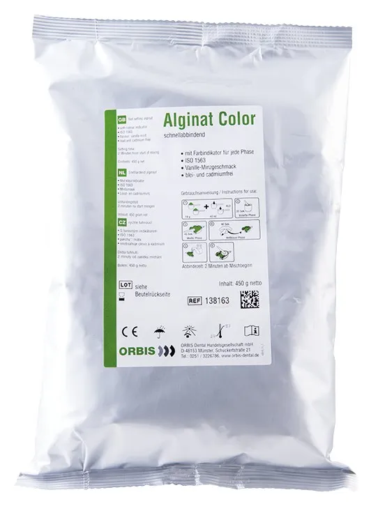 Inovativní, rychle tuhnoucí alginát s barevnou indikací jednotlivých fází ve třech stupních. Míchací fáze, ústní fáze (asi 40 s) a doba tuhnutí (asi 2 minuty po zahájení míchání) jsou indikovány změnou barvy. Pro výrobu studijních modelů, kontrabitových modelů, pracovních modelů pro výrobu ortodontických prací, snímatelných a dočasných náhrad. Vanilková příchuť, světle modrá barva. Dezinfikovatelné, model odlévejte ihned po vyjmutí z dezinfekčního roztoku. Kompatibilní se všemi běžnými sádrami na zhotovení modelů.
