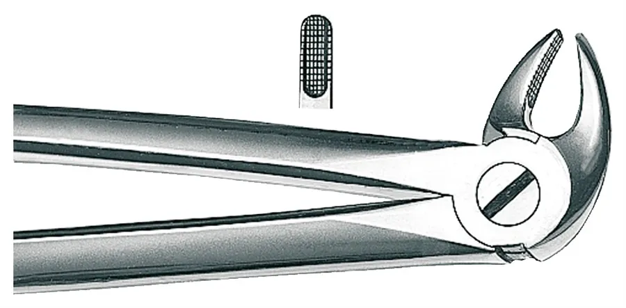Extrakční kleště pevné konstrukce s ergonomicky tvarovanými branžemi se speciálním drážkováním na čelistech pro vysokou adhezi.