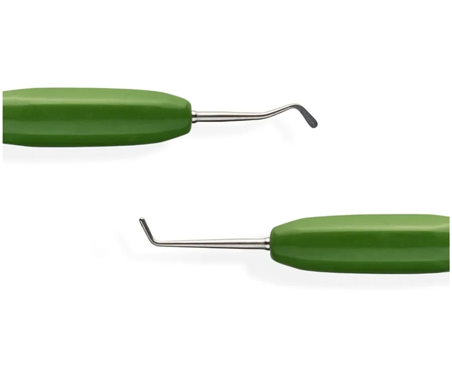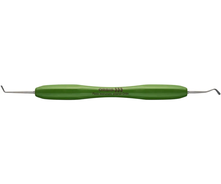 Oboustranný restorativní ruční nástroj s barevně odlišenou, ergonomicky tvarovanou