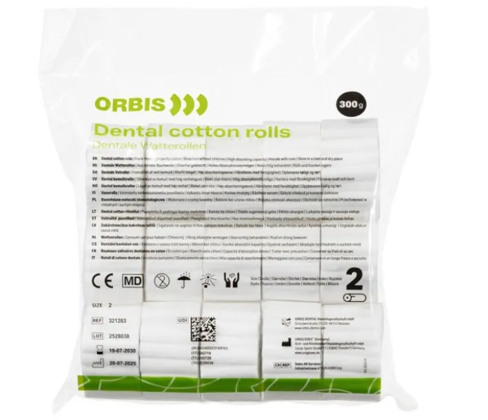 Bavlněné válečky pro udržení suchého a přehledného prostředí v ústní dutině. Vyvážená směs vysoce čisté buničiny a přírodní bavlny zajišťuje dlouhotrvající sací efekt, rozměrovou stabilitu a pružnost. Baleno v sáčku, který válečky chrání před prachem a vlhkostí.
