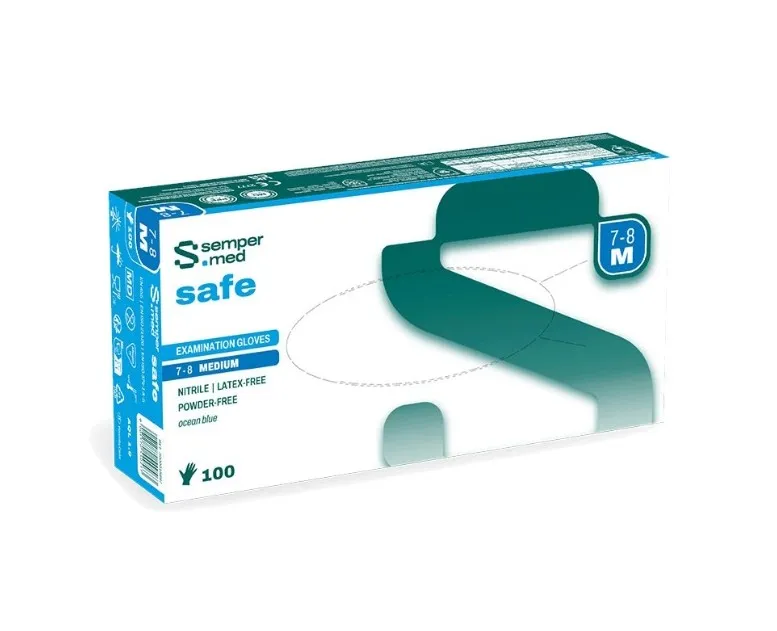 Sempermed Safe Nitriljsou vyšetřovací a ochranné rukavice vyrobené z nitrilu (NBR) bez pudru, které se vyznačují zesílenou stěnou pro výrazně vyšší odolnost proti mechanickému poškození. Díky speciální textuře na konečcích prstů zajišťují spolehlivý úchop i ve vlhkých podmínkách, zatímco jejich typická síla při přetržení dosahuje 9N, což výrazně překračuje minimální požadavek normy EN 455-2 (≥ 6N) a poskytuje tak nadstandardní ochranu.