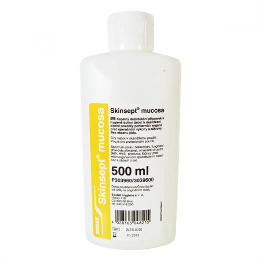 Kožní roztok SKINSEPT MUCOSA k profylaktickému a léčebnému použití na sliznici dutiny ústní a hltanu a profylakticky i na sliznici a okolní pokožku pohlavních orgánů. Neředí se.