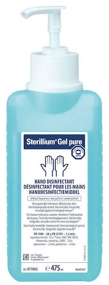 Bode Sterillium Gel pure je alkoholový přípravek na hygienickou a chirurgickou dezinfekci rukou s vynikající péčí o pokožku. Alkoholový dezinfekční přípravek na ruce k použití kdekoliv nezávisle na dostupnosti umyvadla či vody.